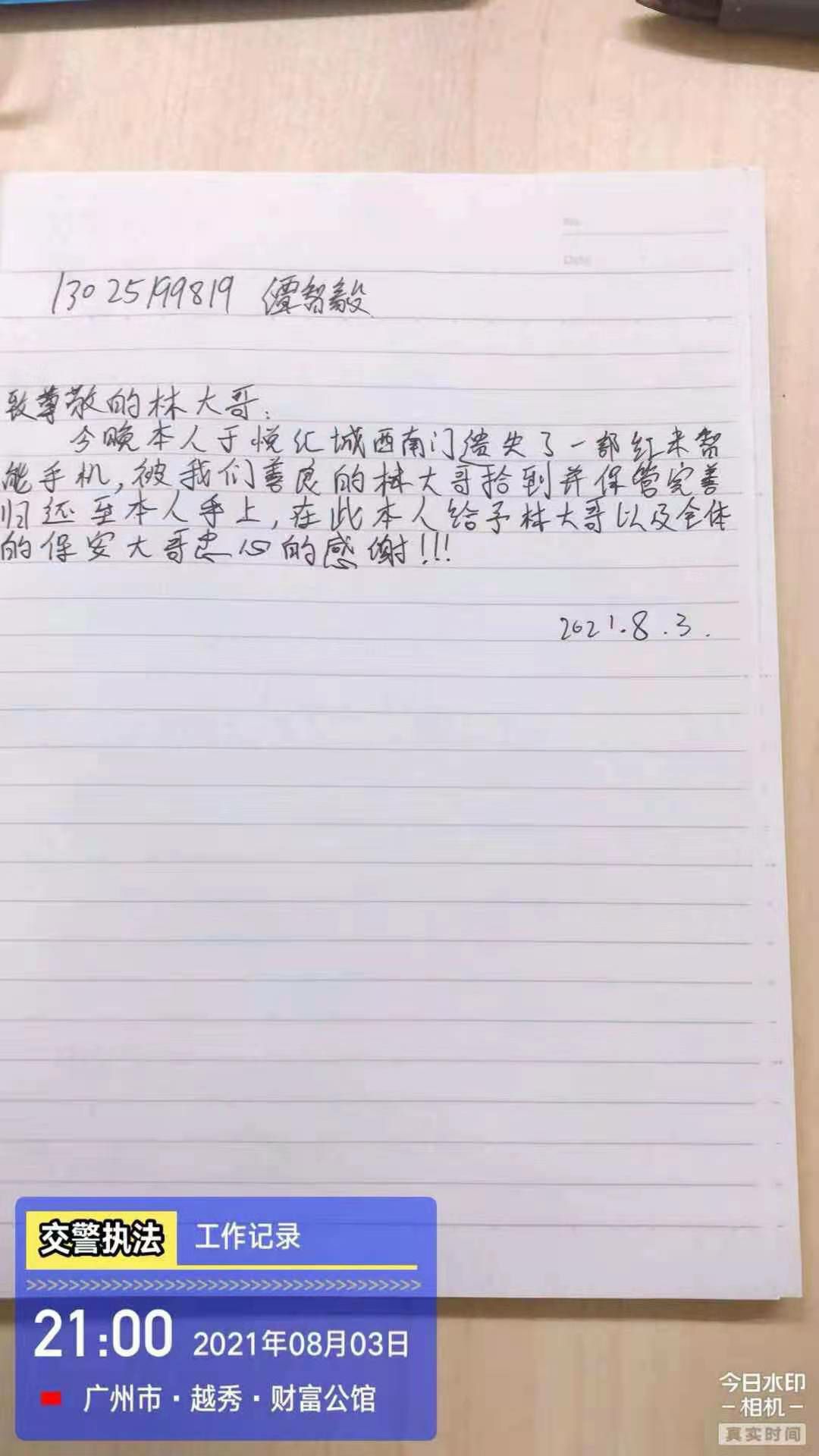 2021年8月3日,开云官方端网站登录入口-开云(中国)驻西村悦汇城保安员林伟强像往常一样准备交接岗,当走至负一西南门门口的时候发现地上有一部黑色智能手机,林伟强在现场等待失主并上报了当班值班经理,不一会儿失主打电话过来,核实了失主身份后将失物归还。失主十分感动,并现场手写感谢信一封以表谢意。